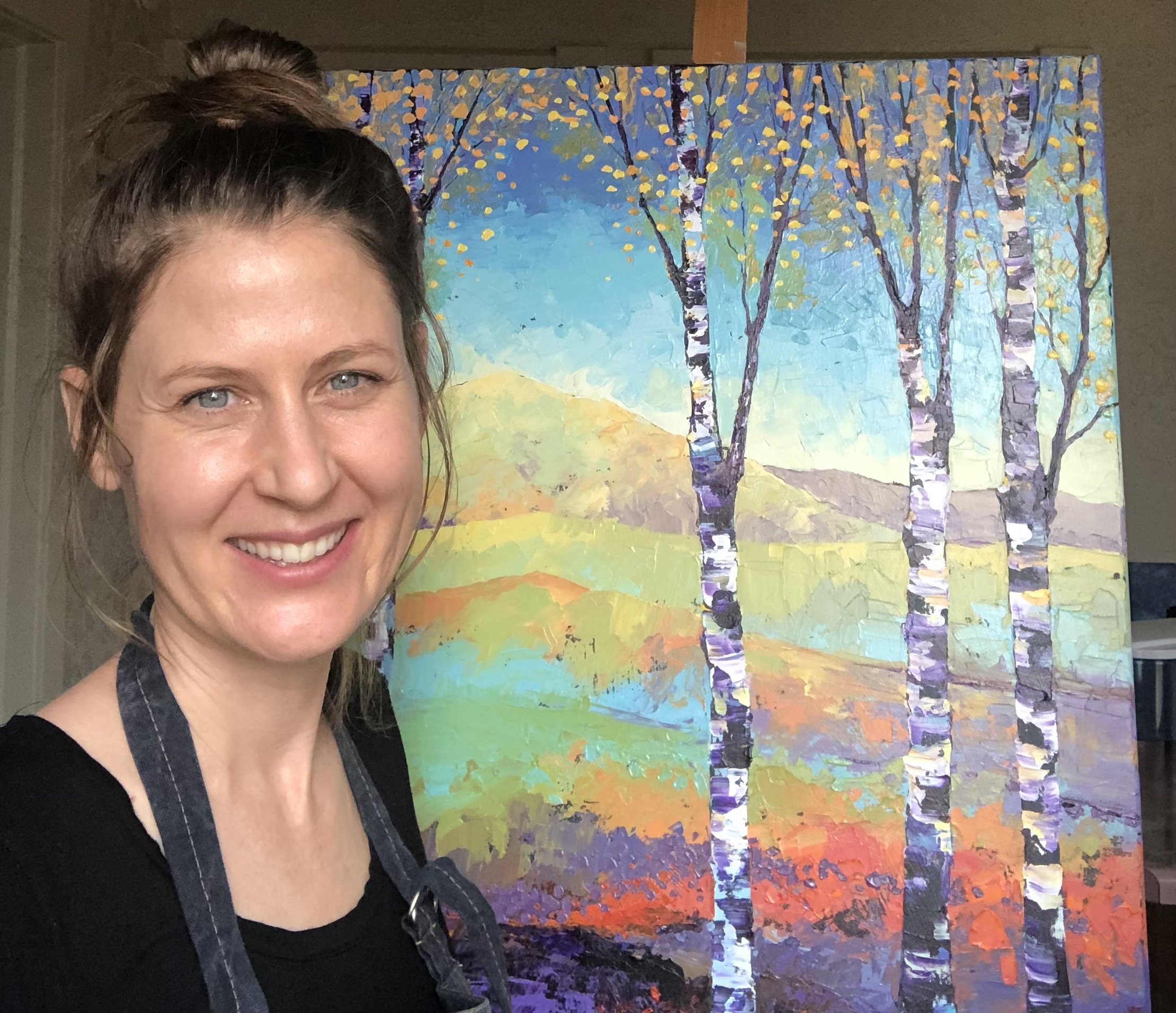 Katie Frey is a Spokane artist who works in acrylic and watercolor and primarily paints landscapes and animals. She has been teaching and creating art in Spokane Washington for over 15 years. She paints with bright colors and expressive lines. The subject matter is planned, but everything else is intuitive: purple shadows, tangled plants, a landscape disintegrating into the abstract. Katie wants her art to be warm and invigorating; to look as spontaneous and joyful as it feels when she creates it.