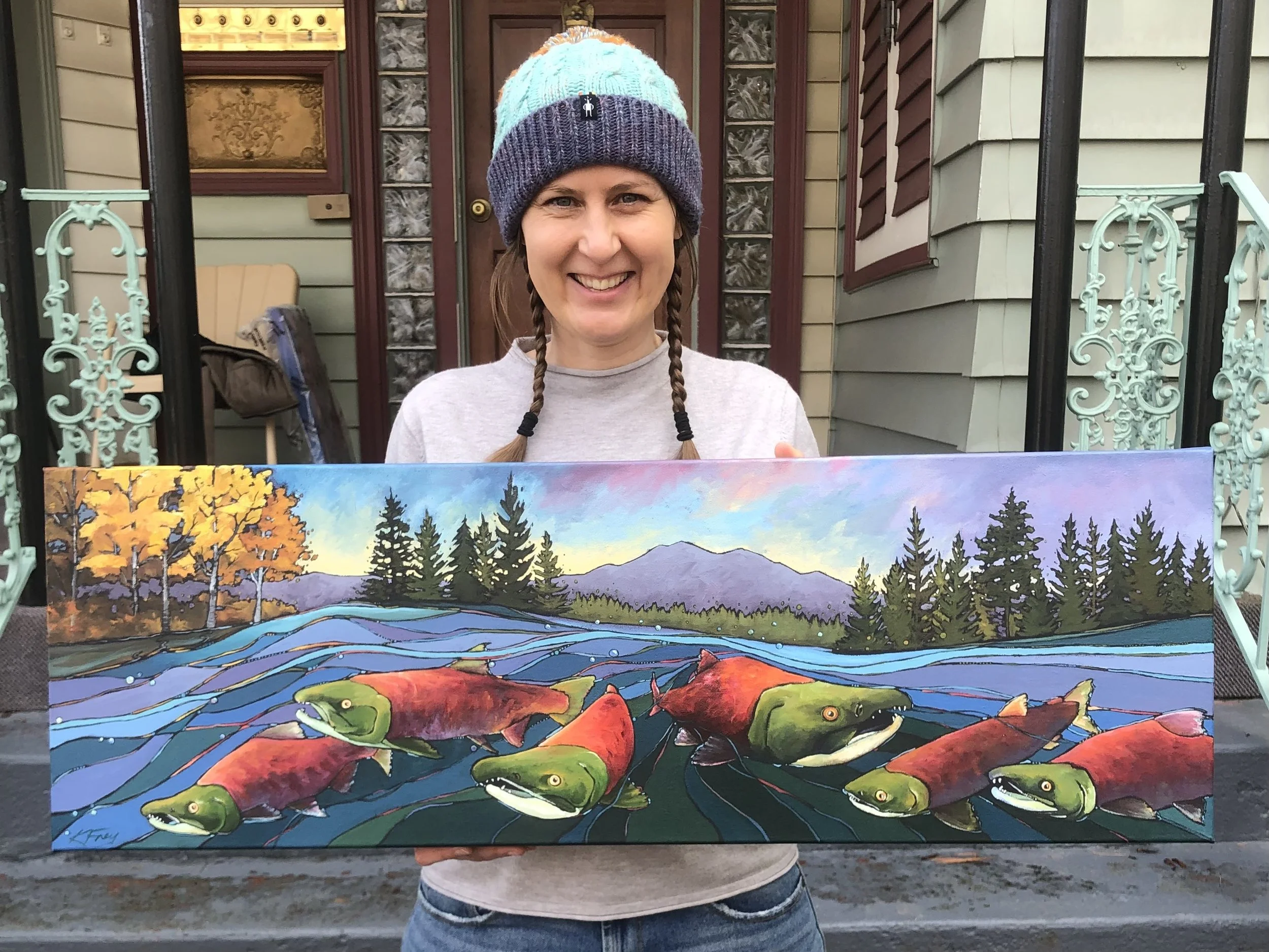Katie Frey is a Spokane artist who works in acrylic and watercolor and primarily paints landscapes and animals. She has been teaching and creating art in Spokane Washington for over 15 years. She paints with bright colors and expressive lines. The subject matter is planned, but everything else is intuitive: purple shadows, tangled plants, a landscape disintegrating into the abstract. Katie wants her art to be warm and invigorating; to look as spontaneous and joyful as it feels when she creates it.
